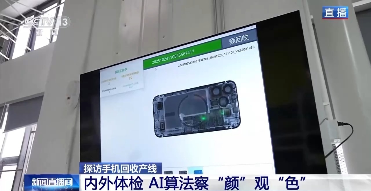 在东莞一家手机回收公司的自动化运营中心,从全国各地运来的废旧手机通过一条100米长的自动化生产线进行“回收方案”。刚刚存放的旧手机都会附有一个特殊的二维码,相当于申请身份证。后续所有流程、所有数据均实时记录,全程可见。