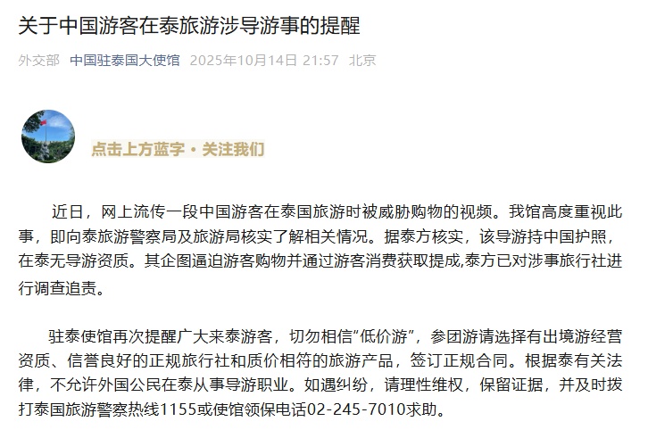 中国驻泰国使馆官方账号截图↑14日,中国驻泰国使馆就赴泰旅游相关事宜向中国游客发出警告:近日,一段中国游客赴泰购物被威胁的视频在网络疯传。使馆高度重视此事,已向旅游警察、泰国旅游部门确认相关情况。据泰方确认,该导游持有中国护照,不具备泰国导游资格。他们试图强迫游客购买并赚取佣金。泰国对此展开调查,并追究涉事旅游公司的责任。驻泰国使馆再次呼吁赴泰游客不要相信“低价游”。对于旅游团体来说,选择质量和价格相匹配的旅游产品并与他们签订正式合同具有合法、信誉良好、具有出境旅游行业资质的旅行社。根据泰国相关法律,外国人不能在泰国从事导游职业。若您出现纠纷,请合理维护自身权益,保存证据,并及时拨打泰国旅游警察热线1155或使馆领保热线02-245-7010寻求帮助。据报道,10月13日,有网友发布一段视频,据称在泰国旅游时遭遇强制消费。导游态度嚣张,用中文威胁游客,称“不花钱就回不了中国”、“到了免税店就上不了车”等。随后他指着视频录制者要求删除。来源:中国驻泰国大使馆、人民网、红星新闻