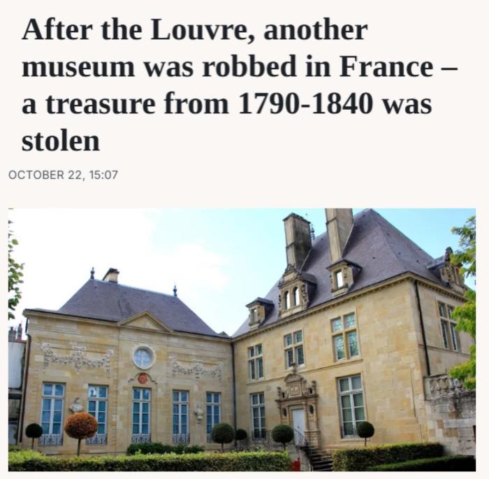 中新社10月23日电 据外媒当地时间22日报道,巴黎卢浮宫发生抢劫事件后不久,法国另一家小型博物馆也遭到抢劫。约2000枚金银币被盗。事件发生后,博物馆暂时关闭。图片来源:外媒报道截图。据报道,被盗物品来自法国东北部上马恩省朗格勒的丹尼斯·狄德罗博物馆。博物馆收藏有 18 世纪的手稿、信件和历史文物。调查人员认为,本案的窃贼是专业人士,有选择地选择目标。报道称,20日,工作人员发现博物馆正门被强行闯入,装有金银币的陈列柜被毁,但馆内其他物品未受影响。当时博物馆里还没有游客。调查人员现在认为这是一起有计划的抢劫案。