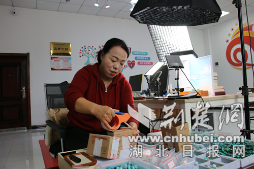 郧西县剑池乡下营村的一位绿松石电商主播正在包装发货。供图:通讯员 王霞